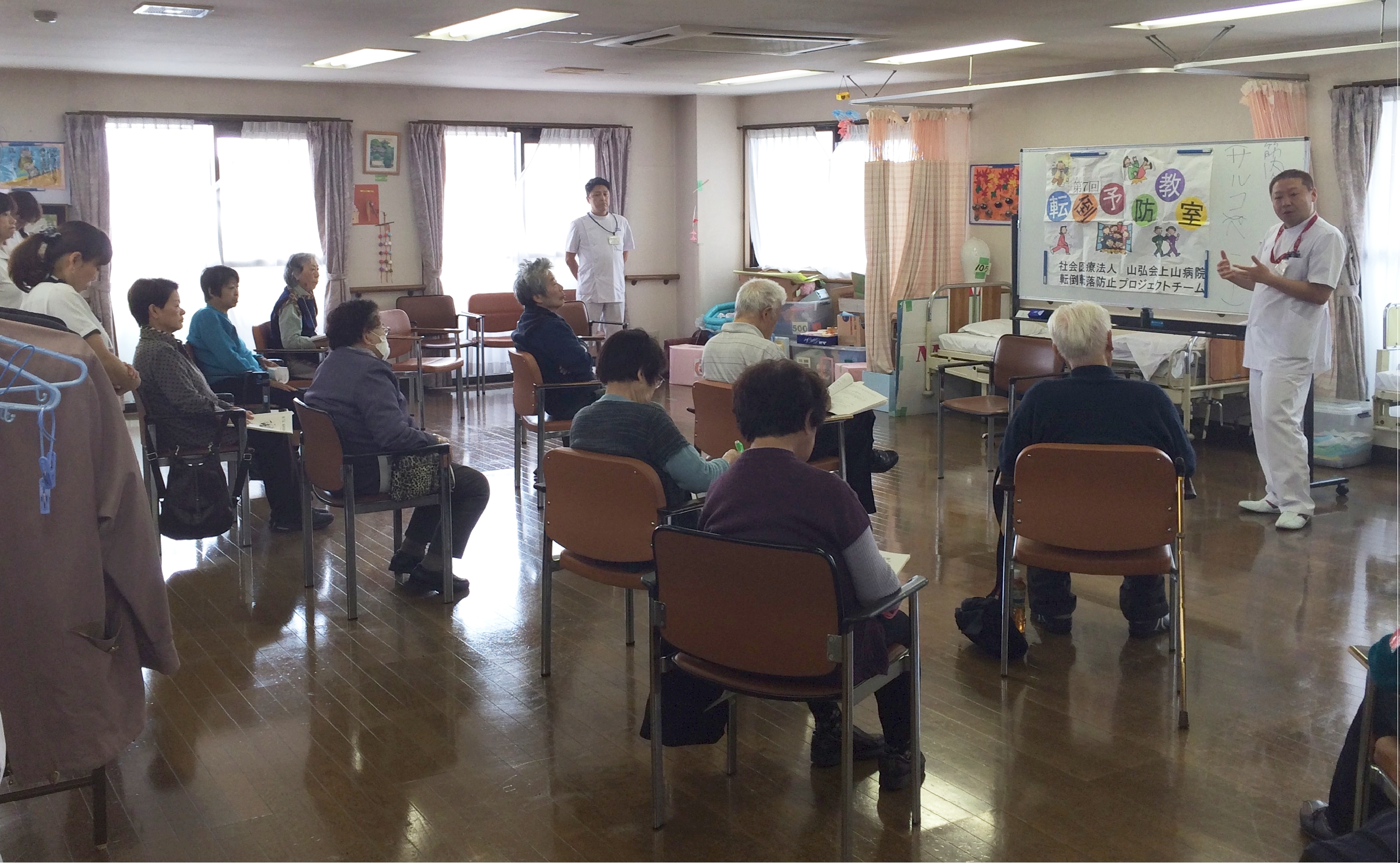 平成25年11月16日(土)上山病院デイケア施設5階において第7回 転倒予防教室を開催しました。小春日和で暖かく、総勢20名。半分の方が初めてで、半分はリピーターの参加でした。年齢は90歳から63歳まで幅広く、平均77.8歳でした。